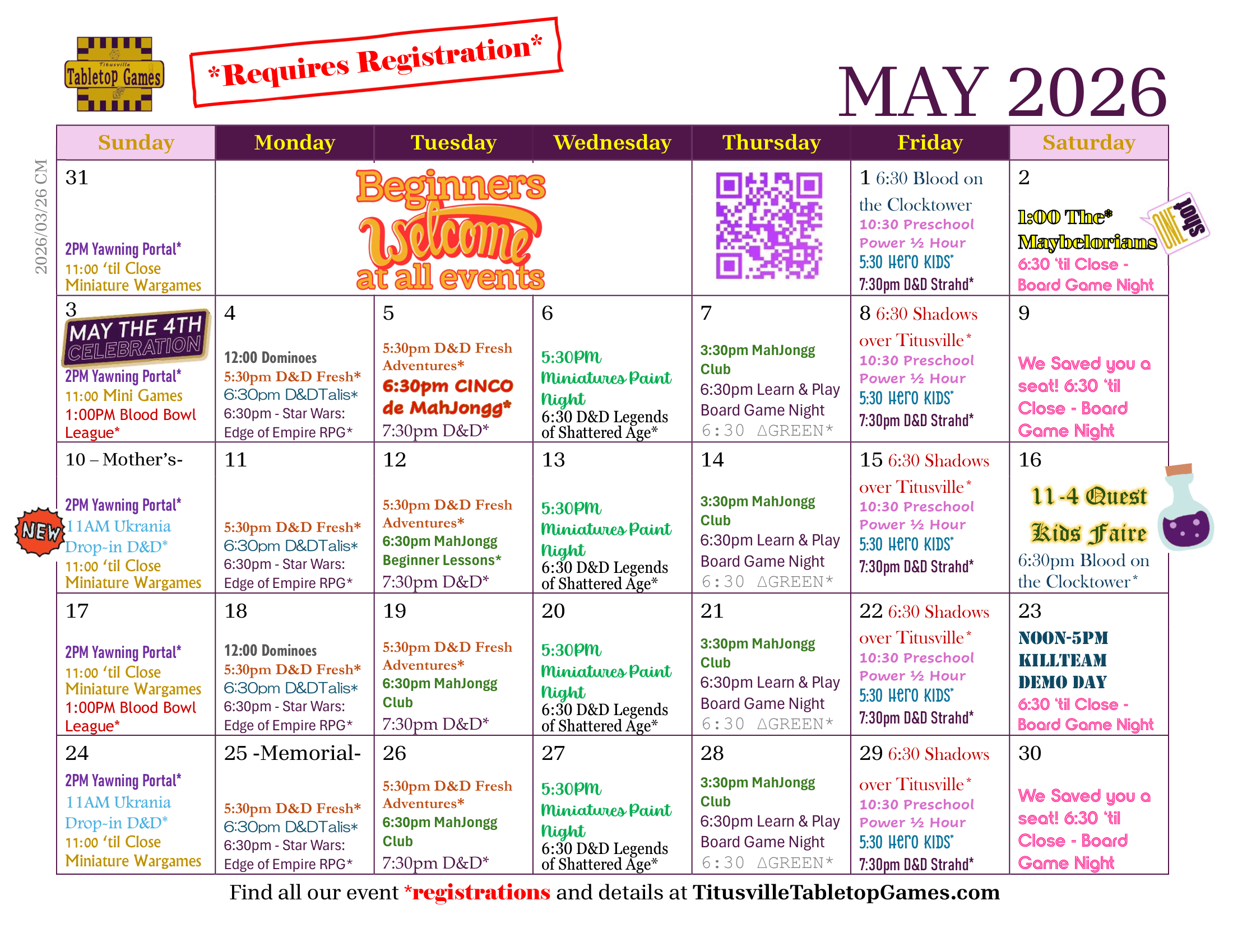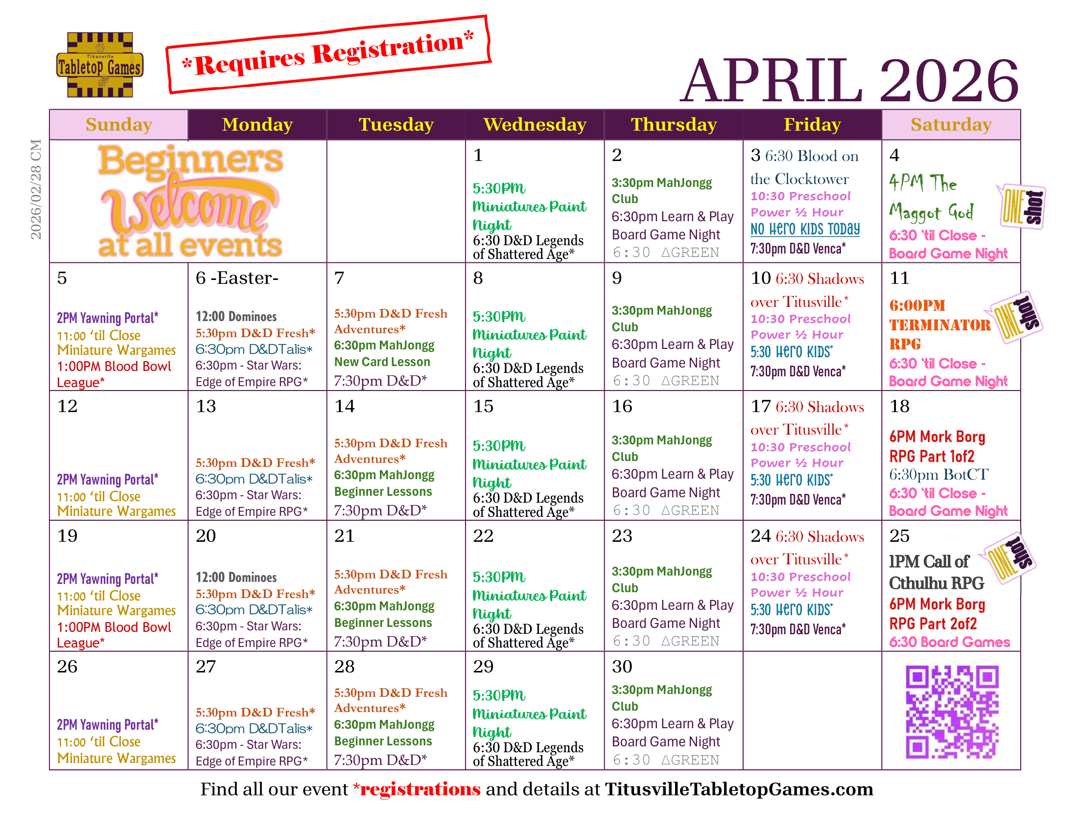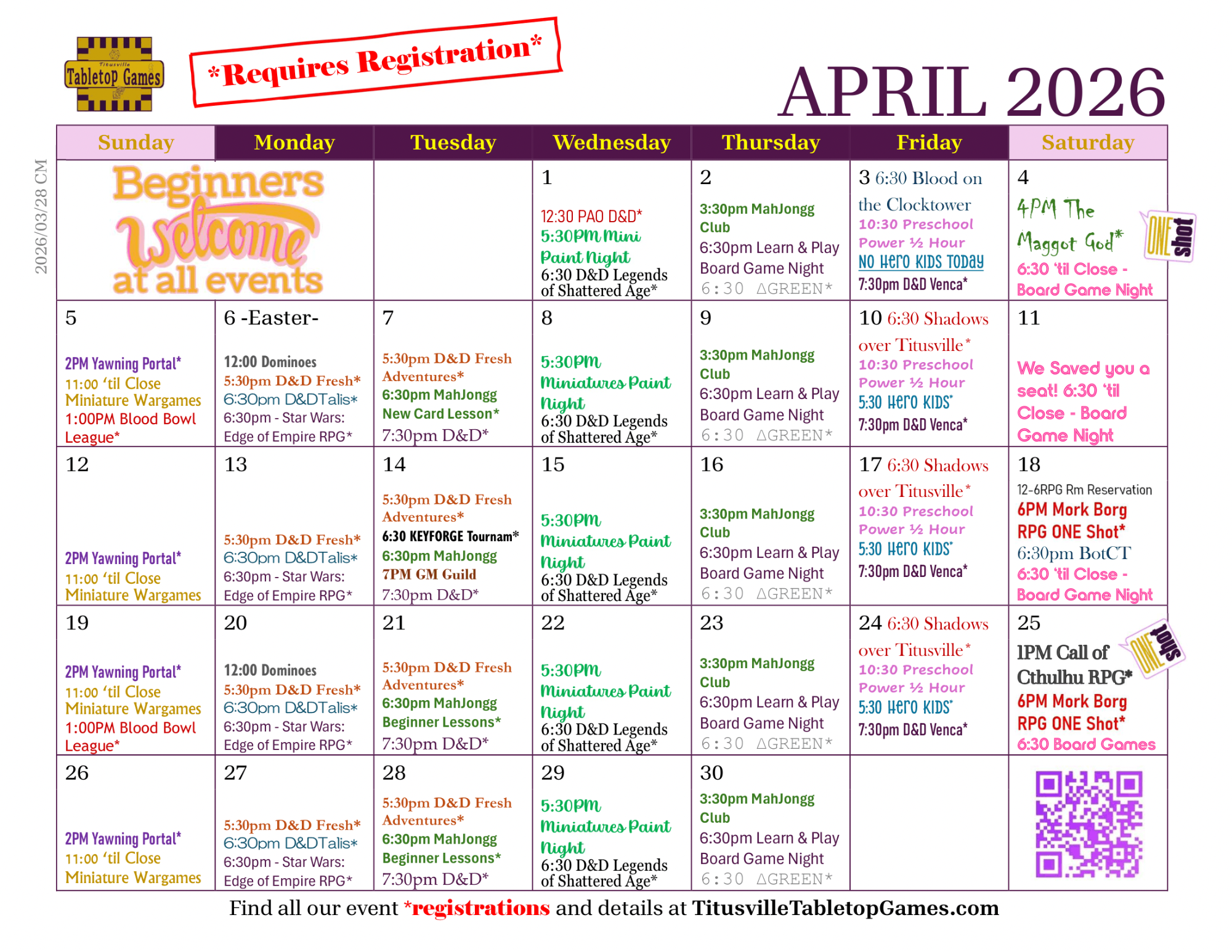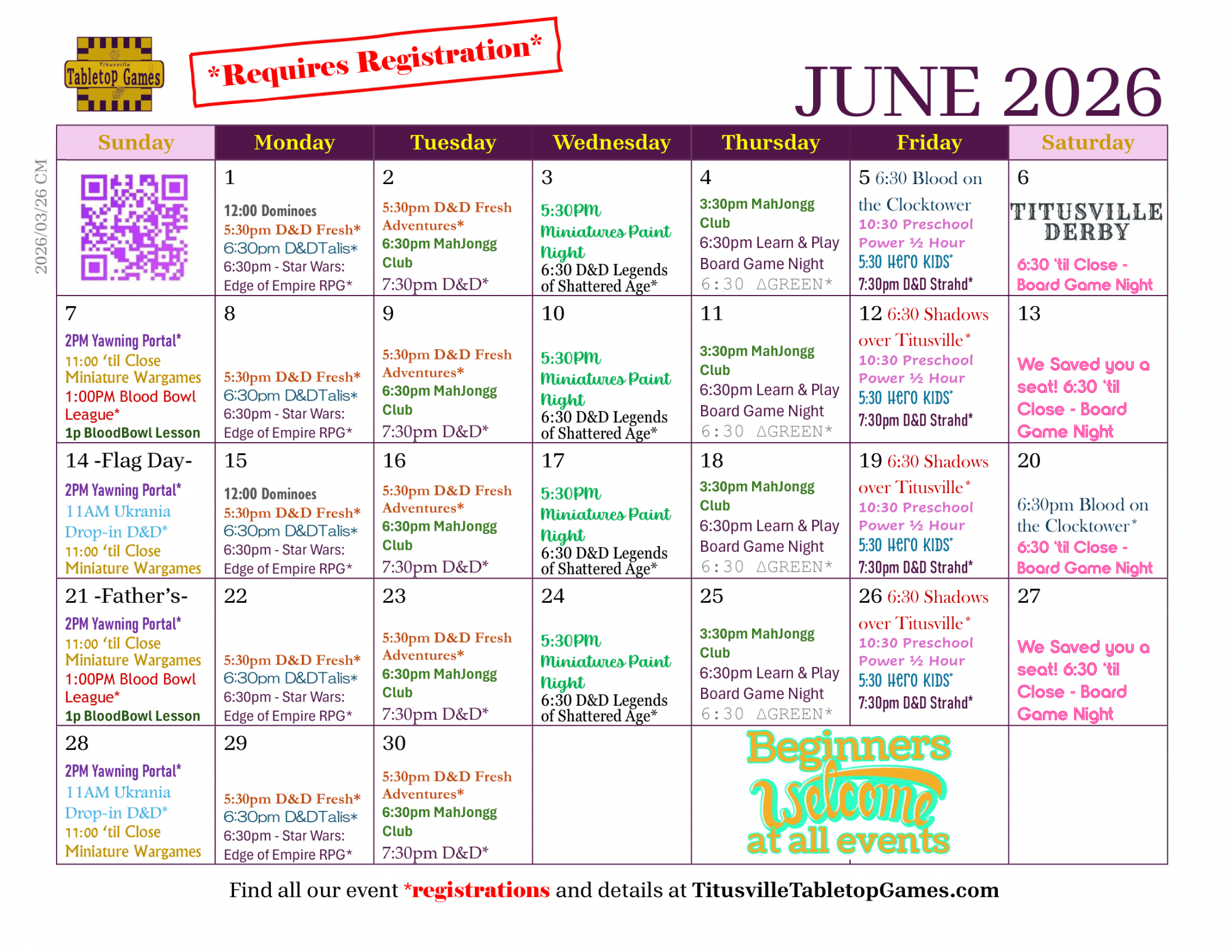 Sundays at 3:30PM. From The Sunless Citadel to Tomb of Horrors, join DM Joe for Tales from the Yawning Portal. Old school D&D adventures revised for 5.5E. Sign up in advance… and bring a few spare character sheets.