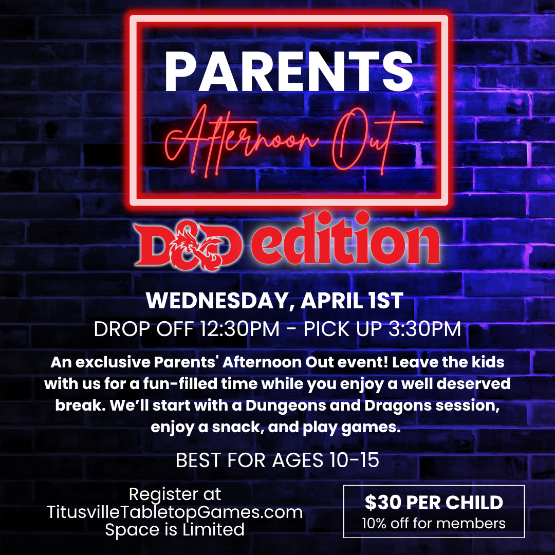 Wednesday, April 1st. An exclusive Parents' Afternoon Out event! Leave the kids with us for a fun-filled time while you enjoy a well deserved break. We’ll start with a Dungeons and Dragons session, enjoy a snack, and play games. Drop off at 12:30pm - pick up at 3:30pm. Best for ages 10-15. $30 per child; 10% off for members.