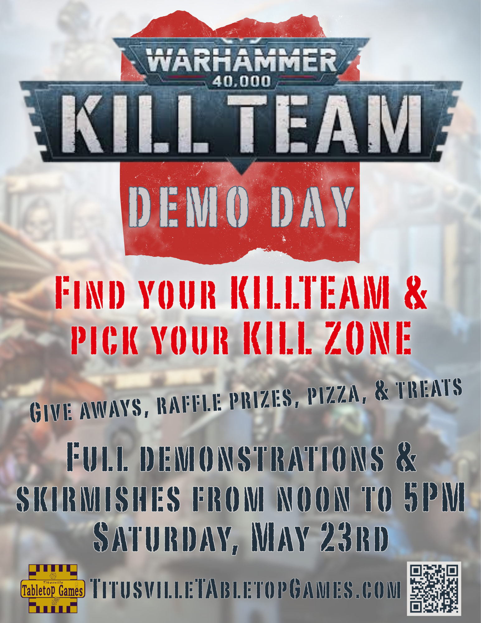 Saturday, May 23rd from noon to 5PM. Find your KillTeam and pick your Kill Zone. Demos of KillTeam for beginners, casual players, and experts. Free full demonstrations and skirmishes all day. Give aways, raffle prizes, pizza, snacks, & treats!