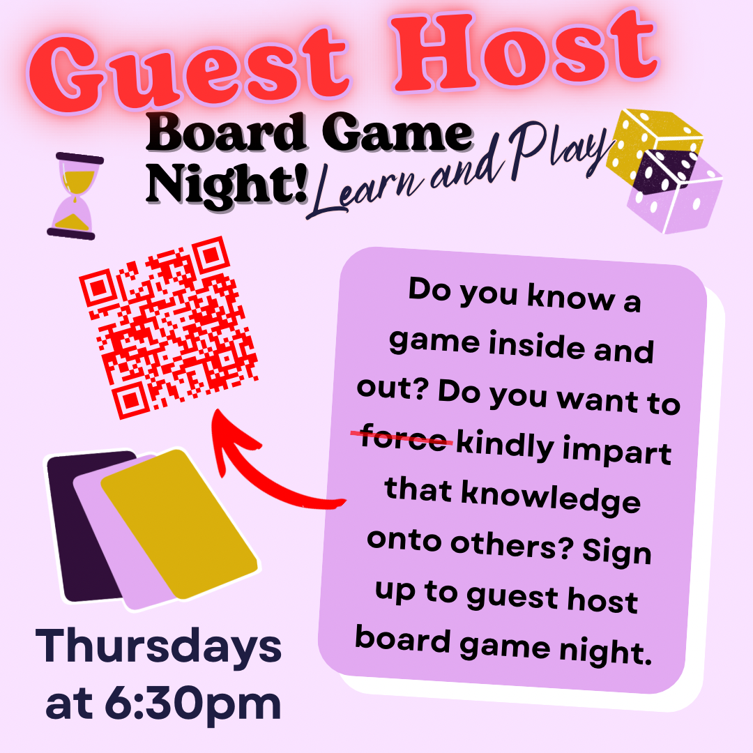 Do you know a board game inside and out? Would you like to share that knowledge with others? Sign up to guest host Board Game Night!
